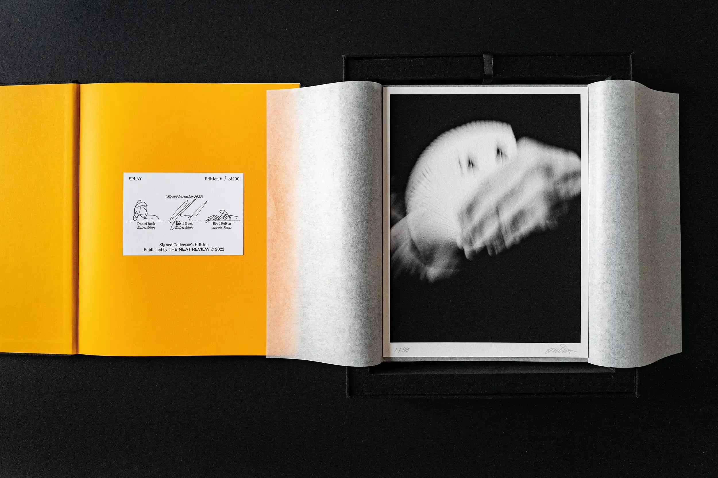 - Deluxe Collector’s Edition. 1 of 100 signed/numbered Books in Midnight cloth with carbon foil block + exclusive SPLAY deck + SPLAY deck with gilded black edges and negative tuck + Brad Fulton Giclee print + two-part presentation box.