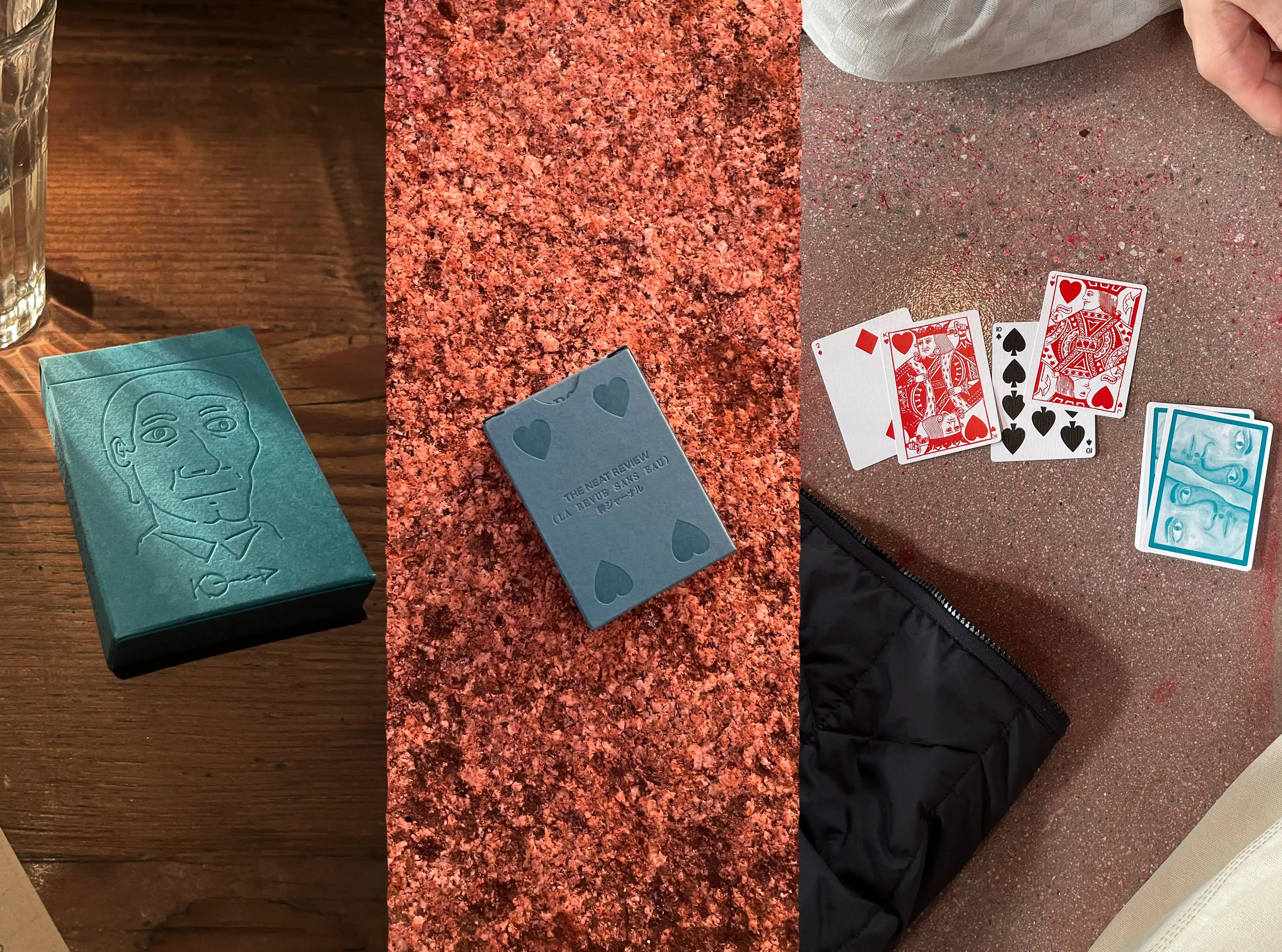 The long-sold-out DEARMERS playing cards from 2021 return in a teal colourway. The back design of these cards is a re-imagination of long-time NEAT REVIEW collaborator Kez Dearmer's 2019 painting "The Alcoholic", featuring a recent embellishment on this painting by Kez on the tuck.